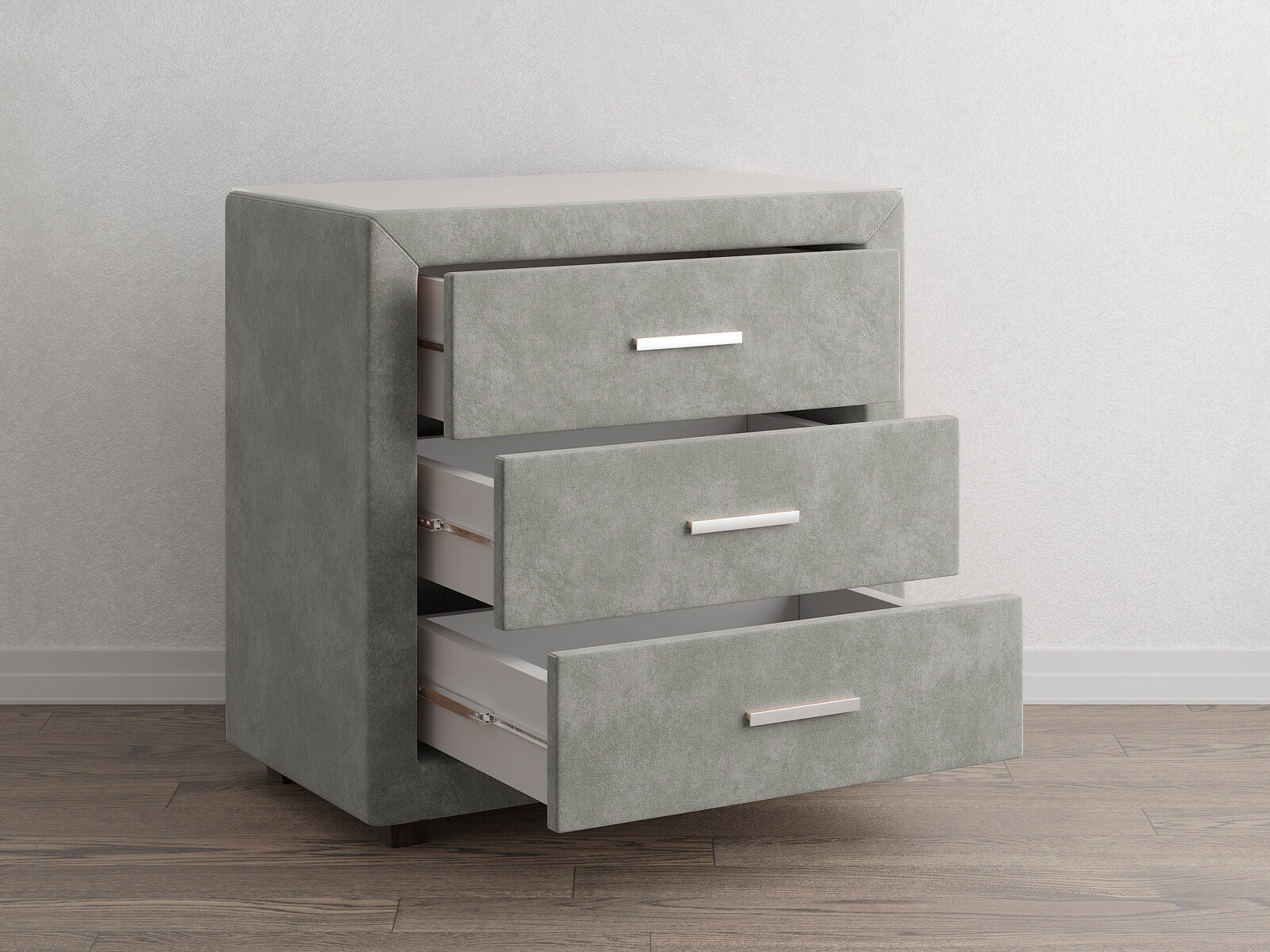 Элегантный комод отличается стильным дизайном и повышенным удобством. Три выдвижных ящика оснащены надёжными направляющими, обеспечивающими лёгкое открытие. Фасад ящиков и стенки комода покрыты обивочным материалом.