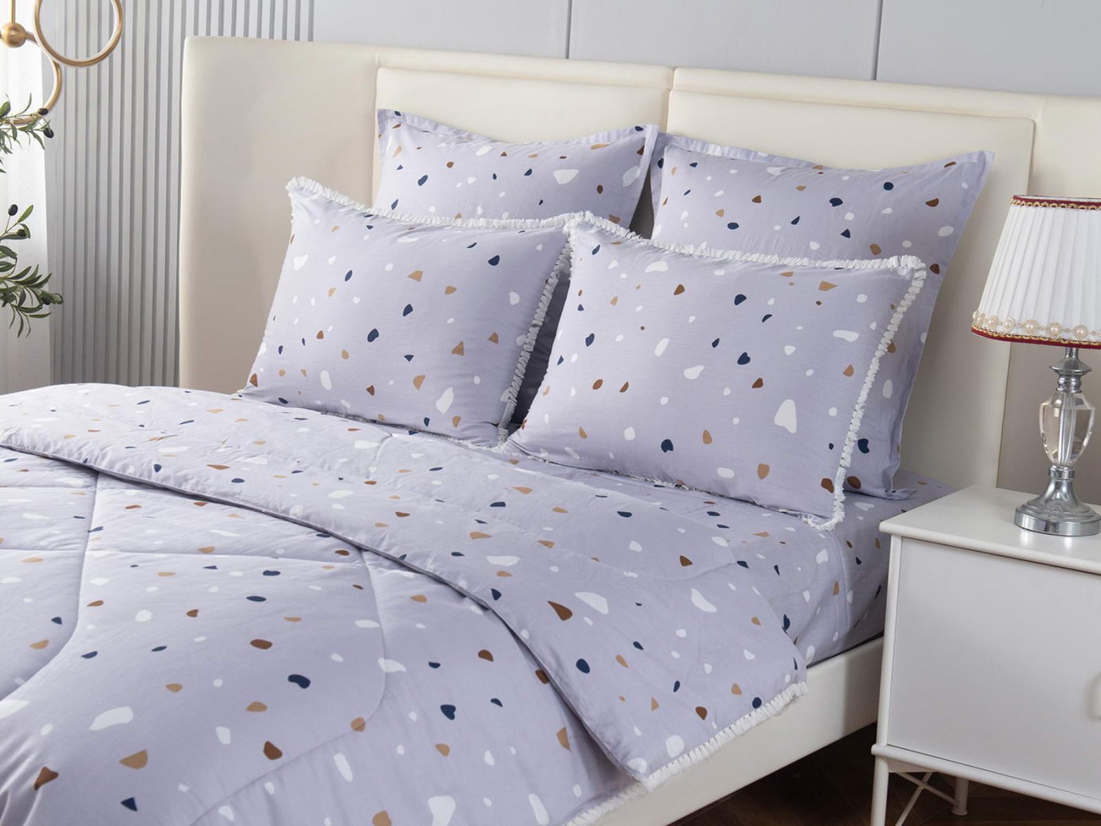 В комплекты комфортеров с одеялом Бернадетт входят наволочки, простыня и легкое всесезонное одеяло. Оцените это современное и очень удобное решение, которое идеально подходит тем, кто не любит возиться с пододеяльниками.
