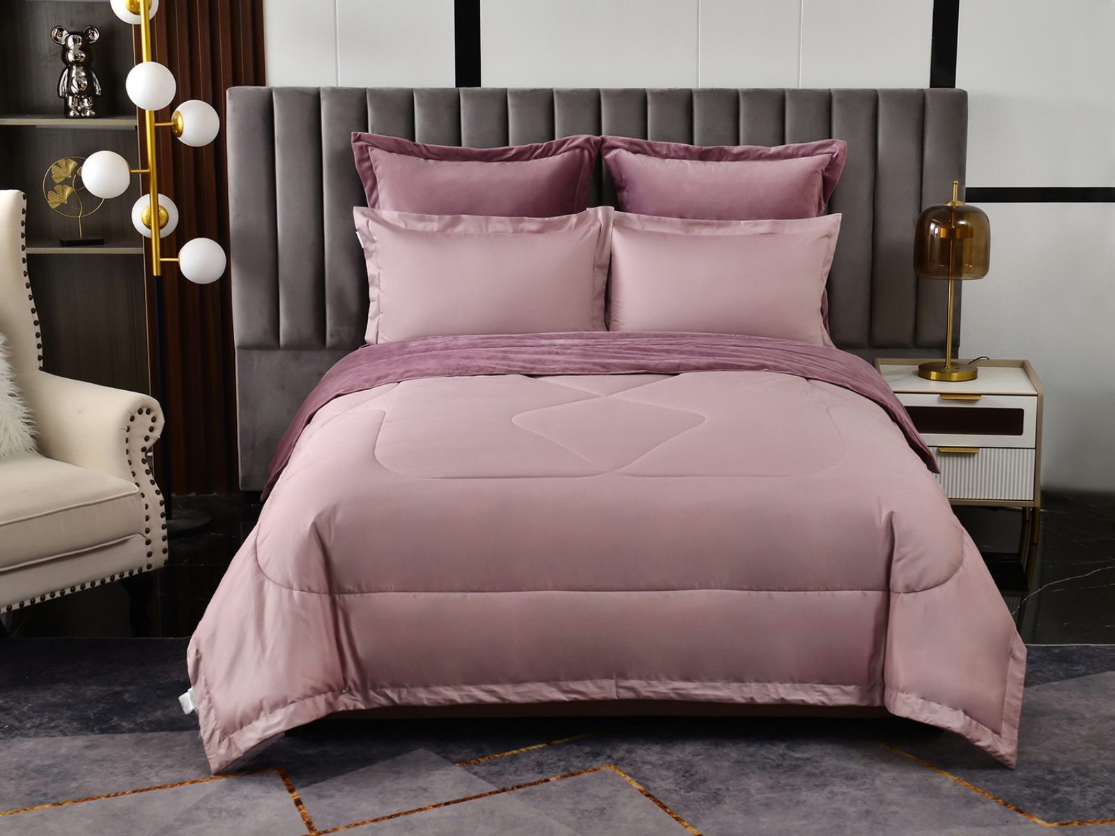 Изготовленный из качественной вискозы и мягкого хлопка трендовых цветов, комплект создаёт приятное ощущение на коже. Его экологичное наполнение из 100% эковолокна обеспечивает гипоаллергенные свойства, подарив вам спокойные и уютные ночи.