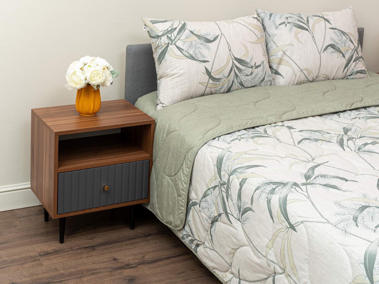Комплект Мелвин легко стирается в обычной машине в бережном режиме и также легко гладится.