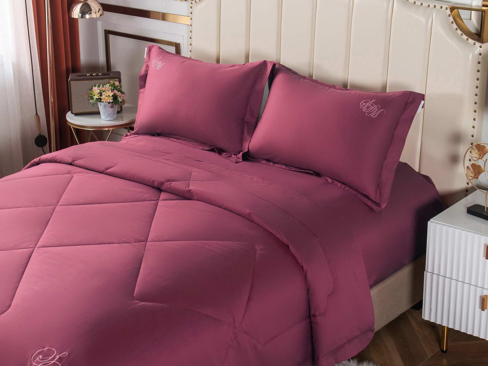 В комплект входят простыня, наволочки и одеяло. Одеяло простеганное, легкое и воздушное, его можно стирать в стиральной машине. Благодаря микроволокну в составе наполнителя для одеяла, оно всегда принимает свою начальную форму.