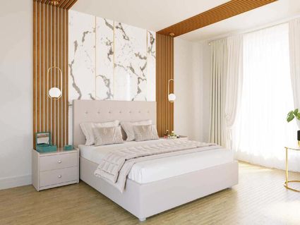 Кровать комплектуется основанием (буковая или металлокаркассная рама) с подъемным механизмом, под которым находится вместительный бельевой ящик для хранения сезонных вещей и постельных принадлежностей.