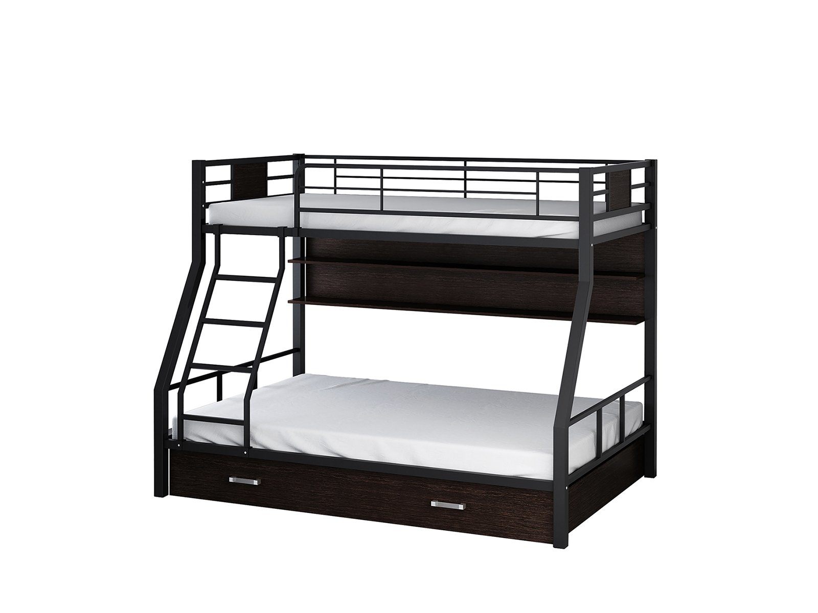 Металлическая двухъярусная кровать Гранада-1 ПЯ с полками и ящиком способна выдерживать нагрузку до 180 кг (на одно спальное место), что делает ее подходящей как для детей, так и для взрослых. Конструкция кровати предусматривает спальные места разных размеров. В отличие от кроватей из ЛДСП выглядит менее громоздкой. В комплект входит прочная лестница, которую по Вашему желанию можно установить справа или слева.