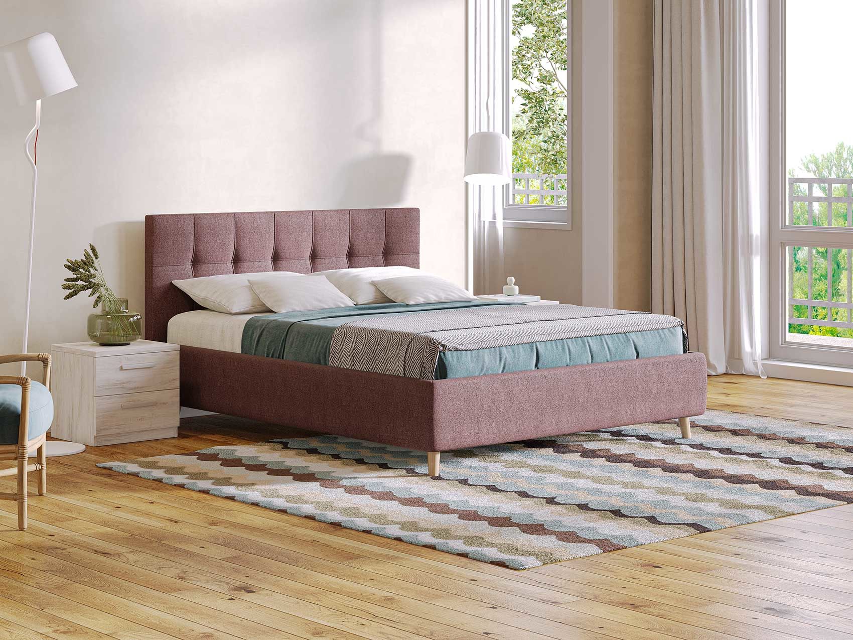 Двуспальная кровать с мягким изголовьем подойдет для современных интерьеров спален, а благодаря высоким деревянным ножкам впишется в стиль ретро, скандинавский или минимализм.
