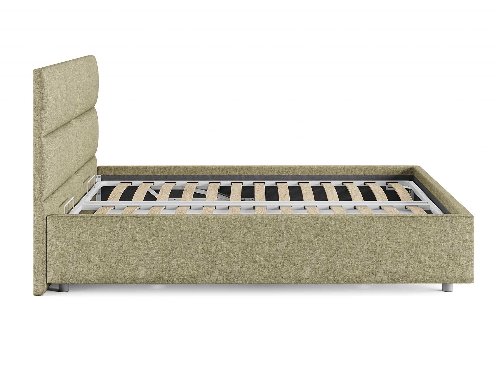 Кровать комплектуется металлическим основанием (без опор), которое имеет 13 рядов встроенных березовых ламелий на каждое спальное место, обеспечивая равномерное распределение нагрузки.