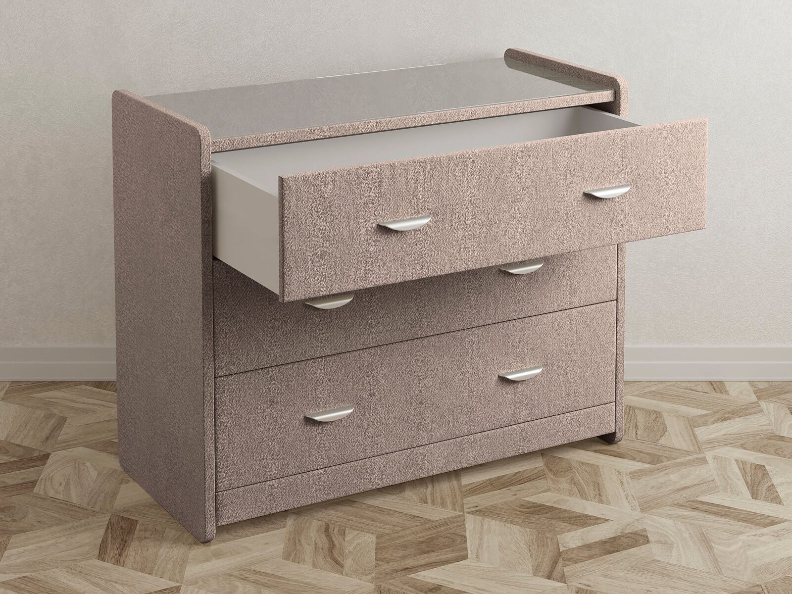 Современный и элегантный комод отличается повышенным удобством. Фасад ящиков и стенки комода покрыты обивочным материалом и выполняются в 43 вариантах цветового исполнения. Для удобства использования и продления срока эксплуатации, рекомендуется использовать стеклянную накладку. Накладка используется в качестве столешницы для тумбы и защищает ее от повреждений и загрязнений. Стеклянная столешница заказывается дополнительно.