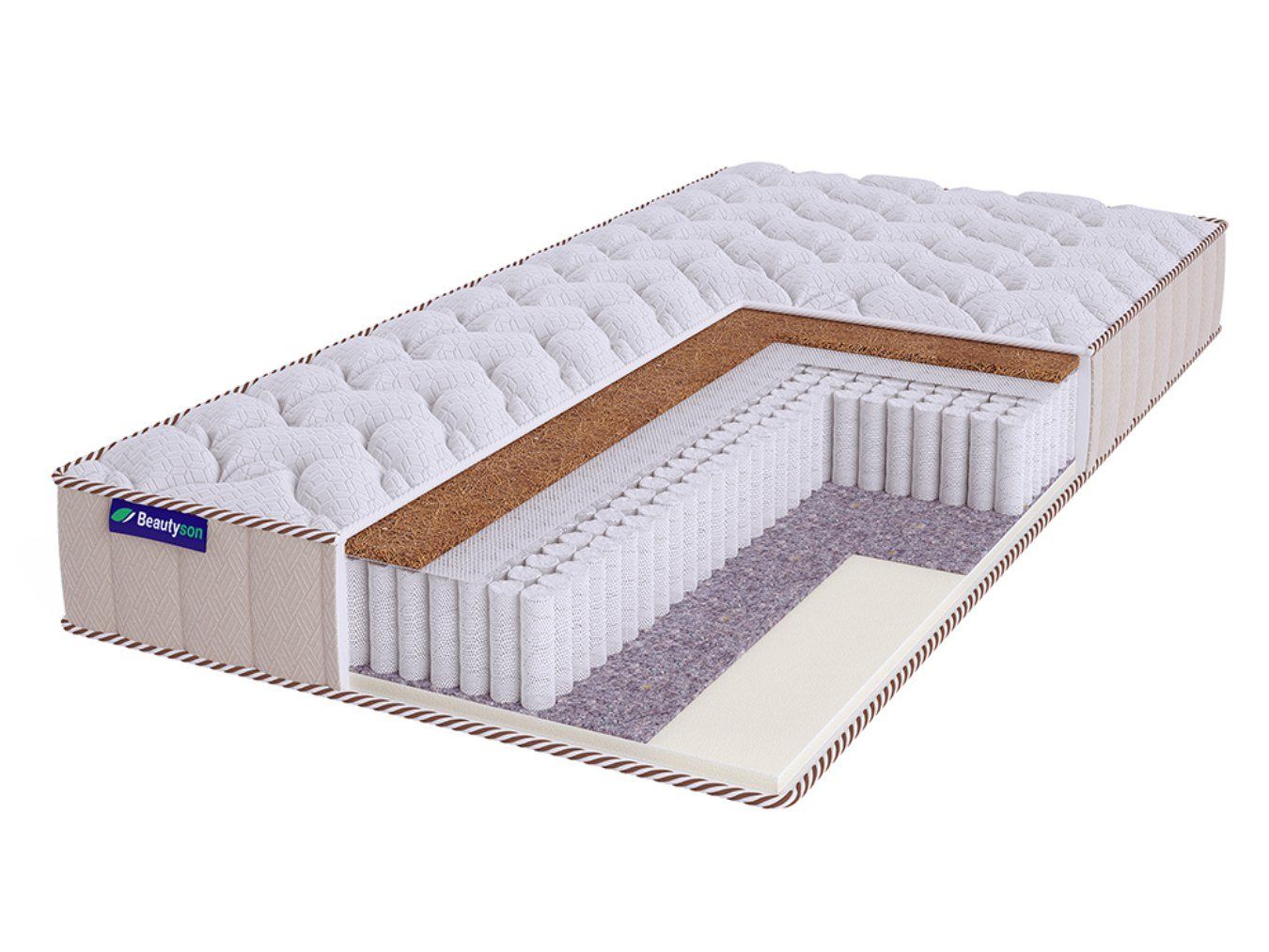 В качестве обивочного слоя в матрасе реализован прочный трикотаж. Ткань получила стёжку по холлофайберу, поэтому обивку украшает мягкие рельефный рисунок.