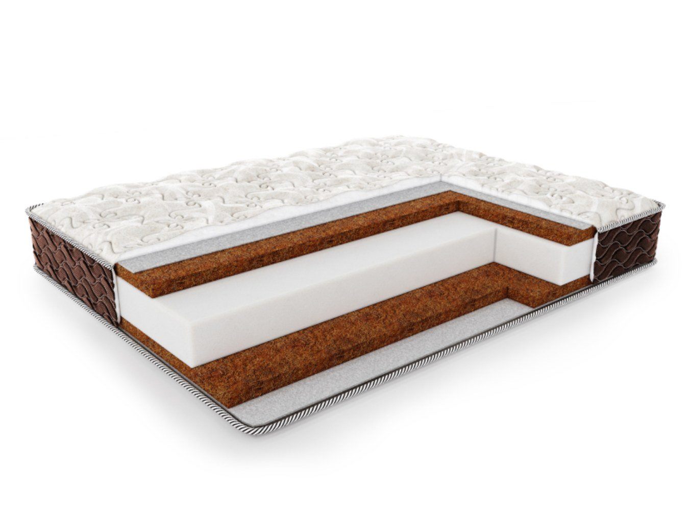 У каждой из поверхностей спальной принадлежности расположился 3 см слой койры кокоса. Данный наполнитель является одним из самым популярных жёстких материалов, поскольку обладает высокой прочностью. Однако более всего он ценим за ортопедические возможности, которые он щедро передаёт спальному месту.