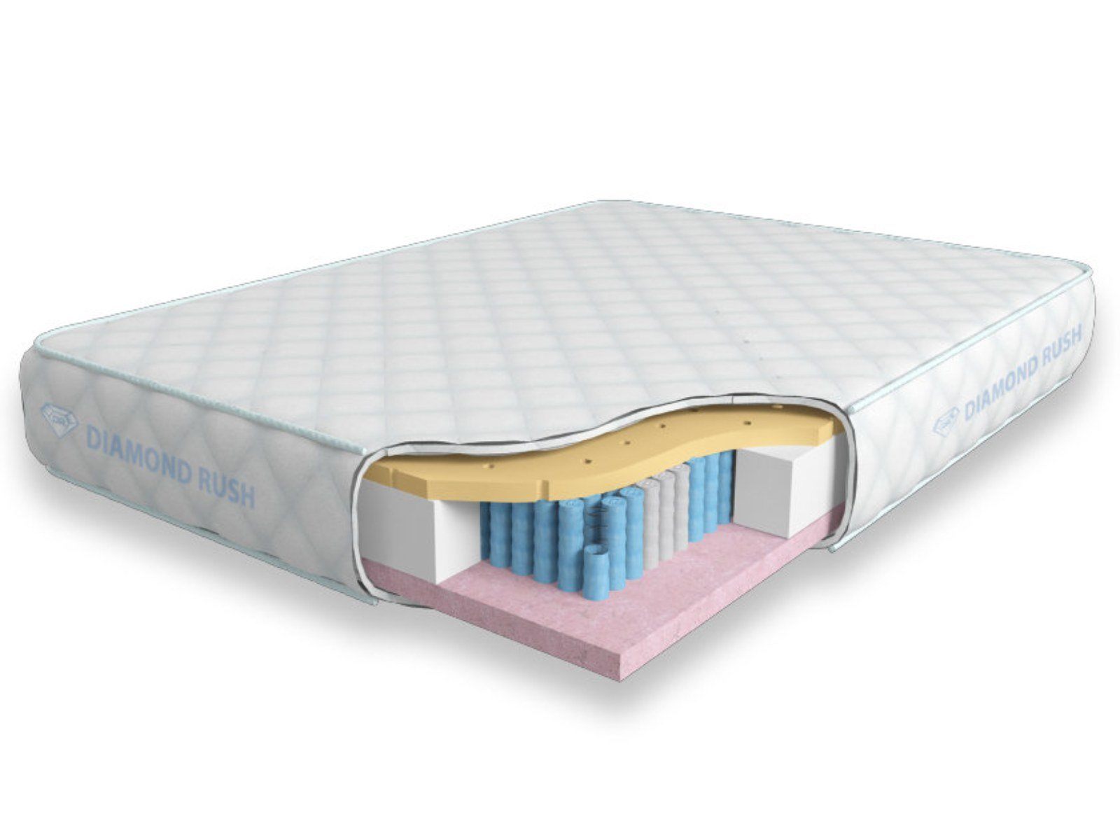 Данный матрас из серии Luxury Diamond имеет в своей основе независимый пружинный блок MultiZone, состоящий из пружин диаметром 3-4 см разной жесткости. В качестве настилочных слоев поверх пружинного блока используются листы натурального латекса с перфорацией и вязкоэластичного Меморикса, обладающего эффектом памяти. Обе стороны матраса являются мягкими.