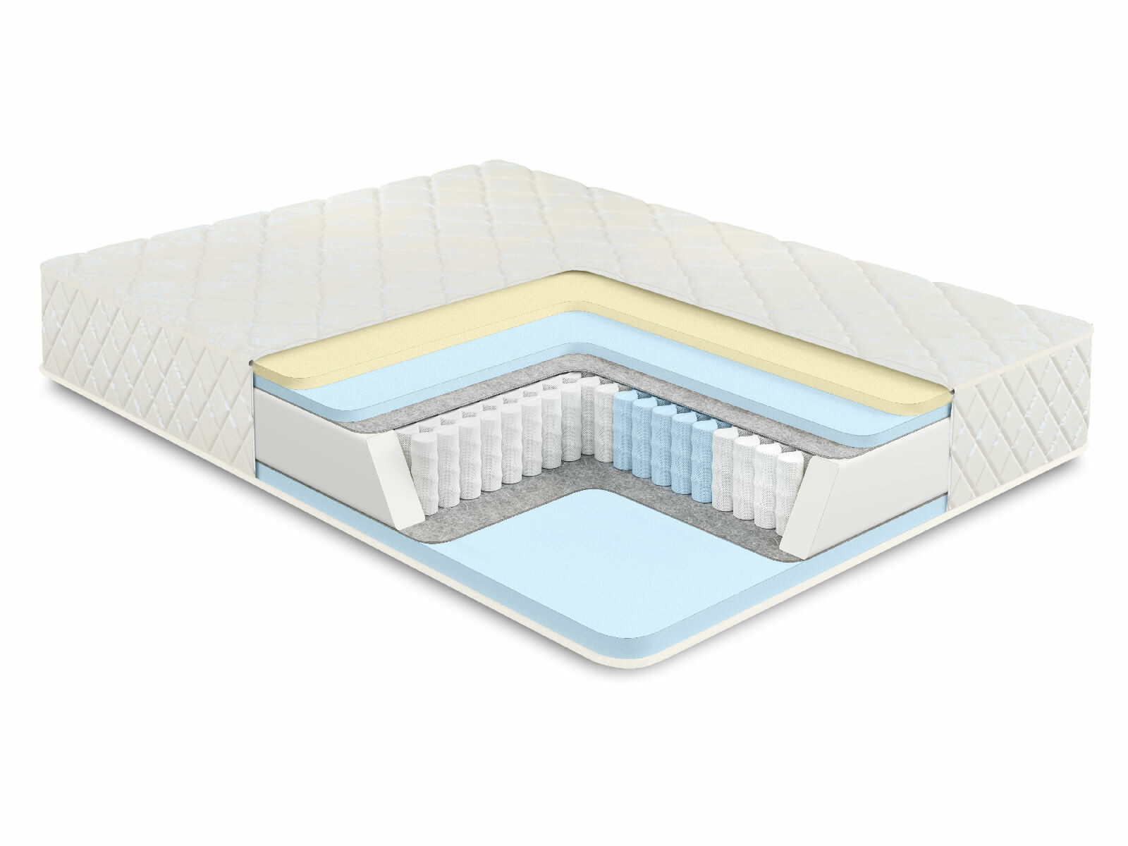 Пружинный матрас в основе которого многозональный независимый пружинный блок 1000 пружин на спальное место обеспечивает ортопедическую поддержку и комфорт во время сна. Независимые пружины подстраиваются под формы человека, потому что каждая пружина находится в отдельном кармашке и обеспечивает равномерное распределение веса.