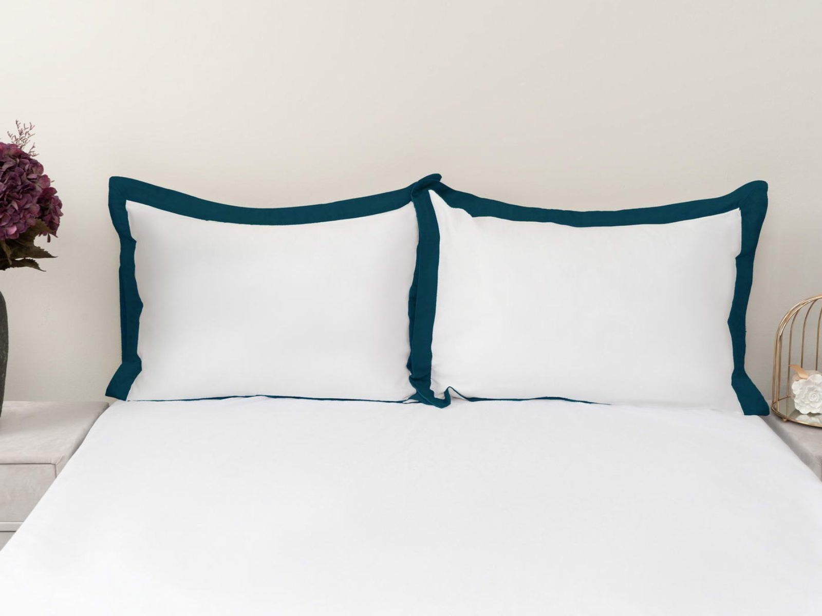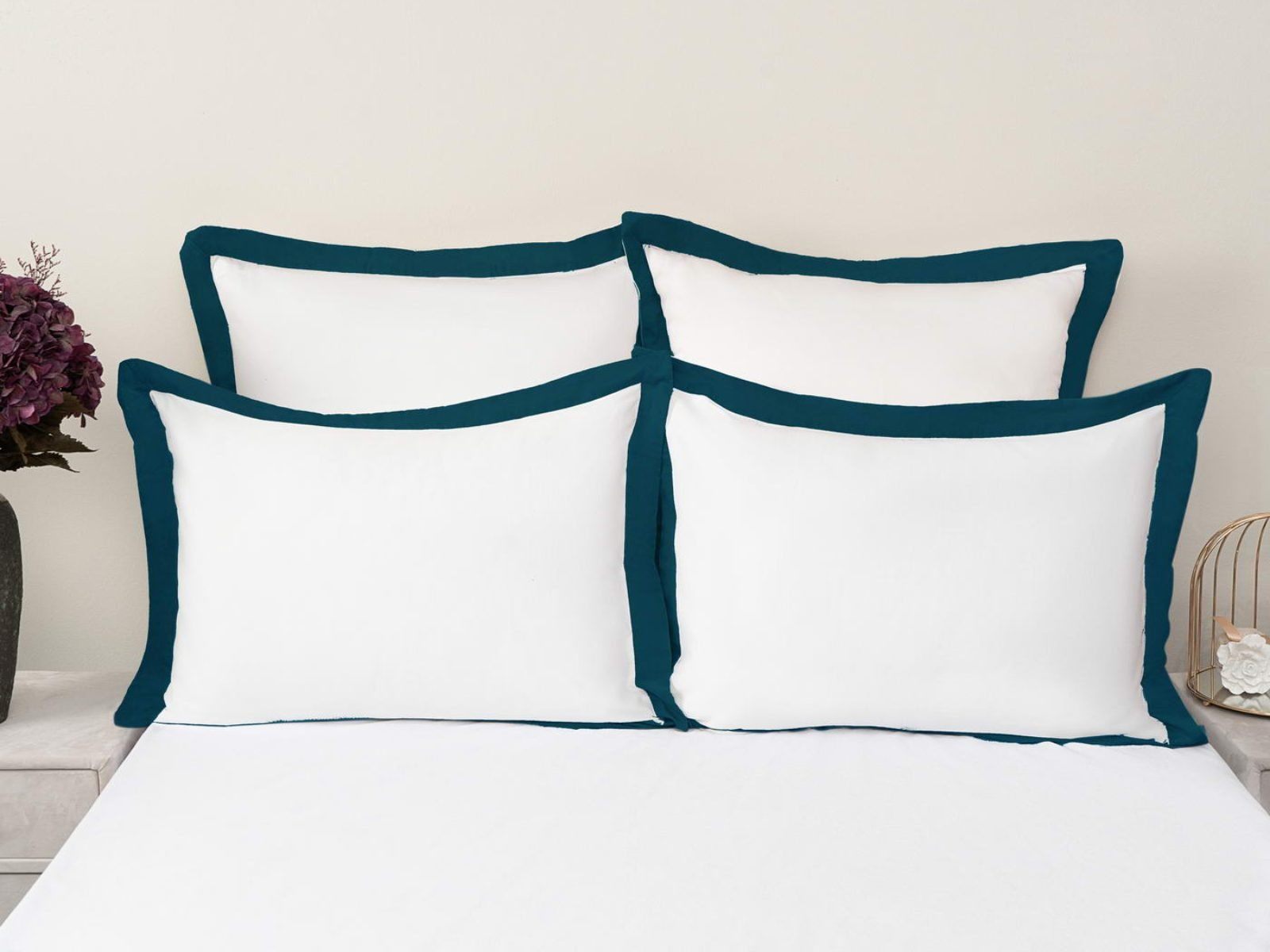 Особенность: белые наволочки декорированы контрастными цветными ушками 5 см с четырех сторон. Наволочки на запахе.