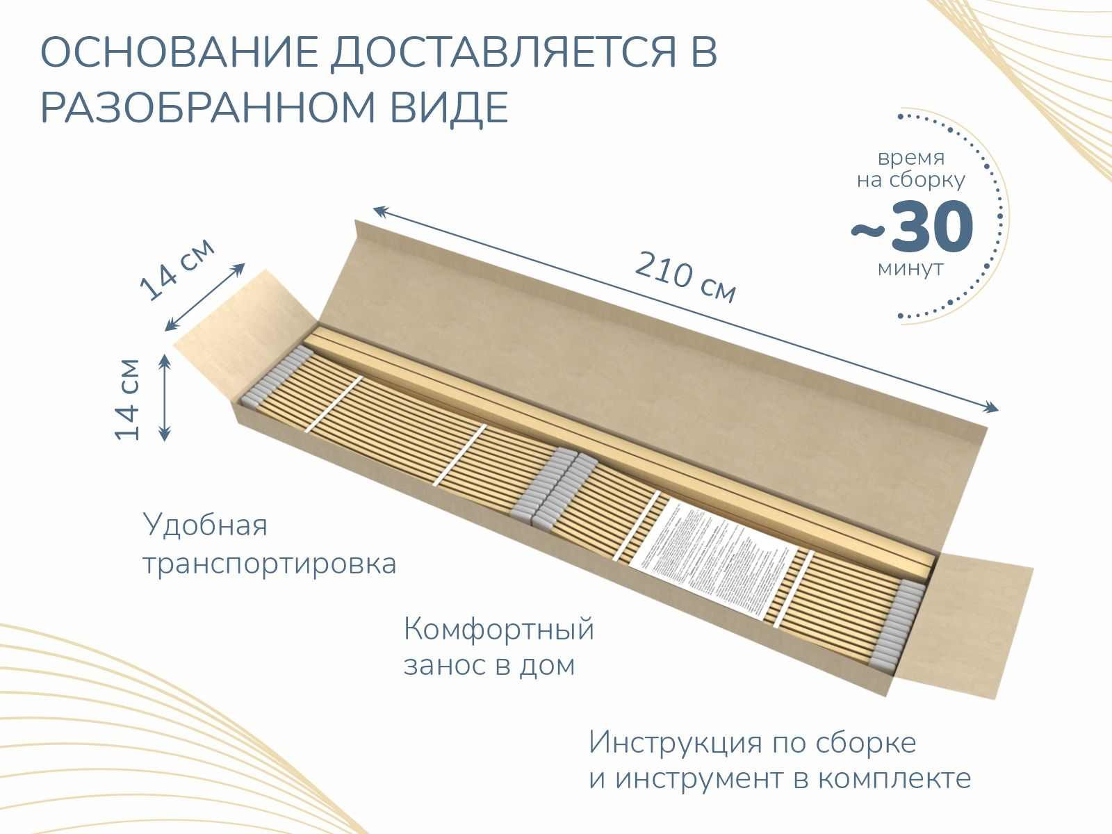 Основание для матраса - клееная фанера из березы сечением 50х25мм. Идеально подходит для матрасов на независимом пружинном блоке, так как благодаря небольшому (около 3 см) расстоянию между латофлексами, не допускается проседание пружин в блоке.