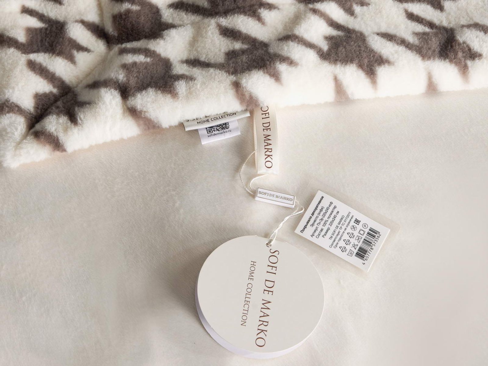 Sofi De Marko представляет вашему вниманию коллекцию Эрнесто, включающую в себя пледы и декоративные наволочки из искусственного меха с принтом «гусиная лапка».