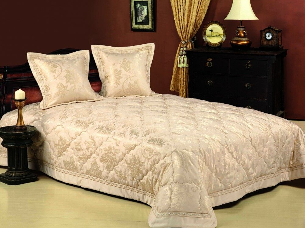 Верх покрывала выполнен из жаккардового люкс-сатина (45% хлопок и 55% вискоза), оборотная сторона из поликоттона, наполнитель - тонкий слой синтепона.