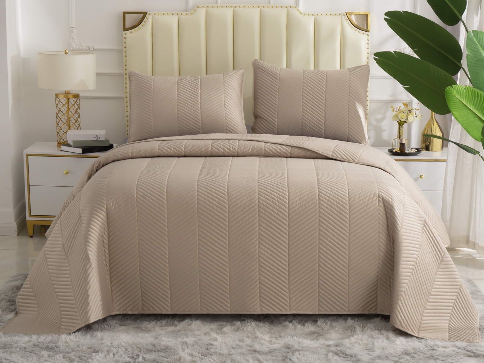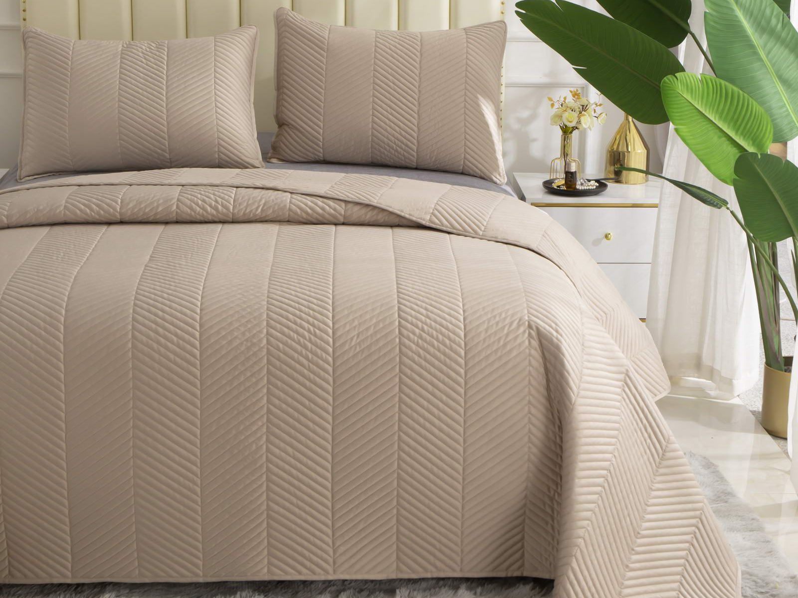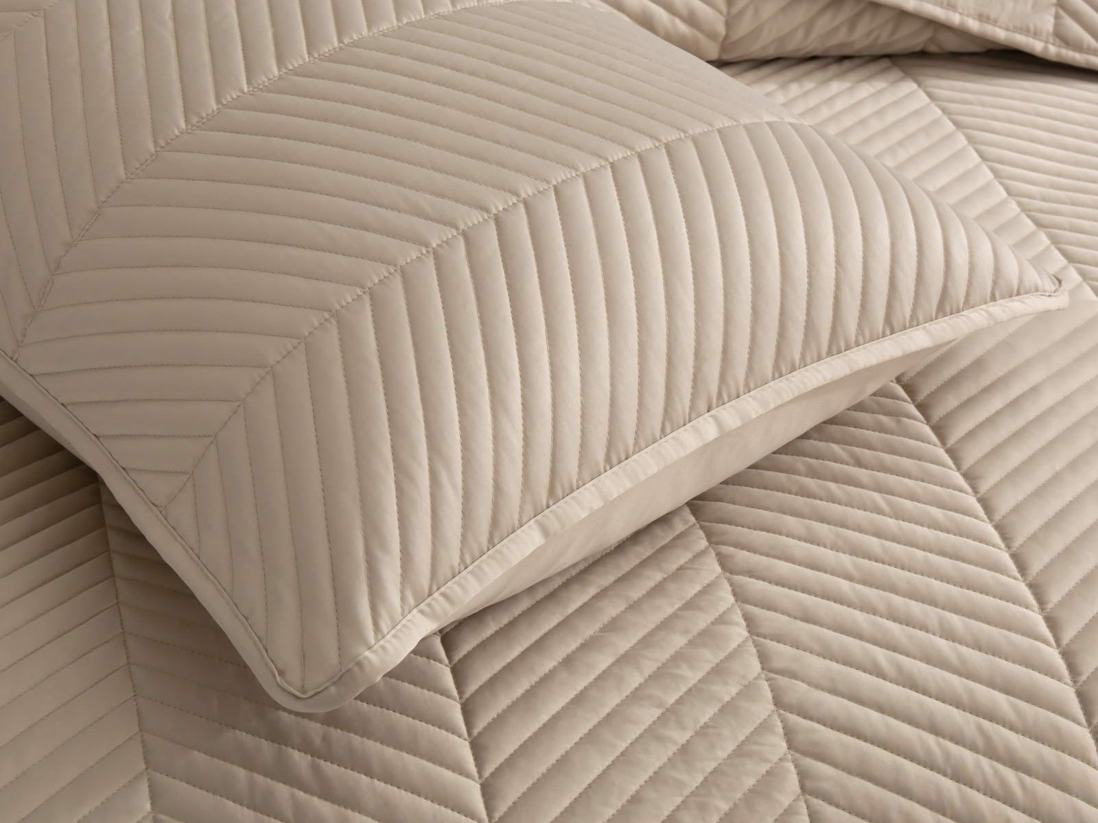 Стёганое дышащее покрывало Адонис на 70% состоит из хлопка и на 30% из вискозы. Ткань изделия гладкая и приятная на ощупь. Декоративный кант и ритмичный «елочный» рисунок, выступающий над поверхностью, придают покрывалу игривый утонченный вид.