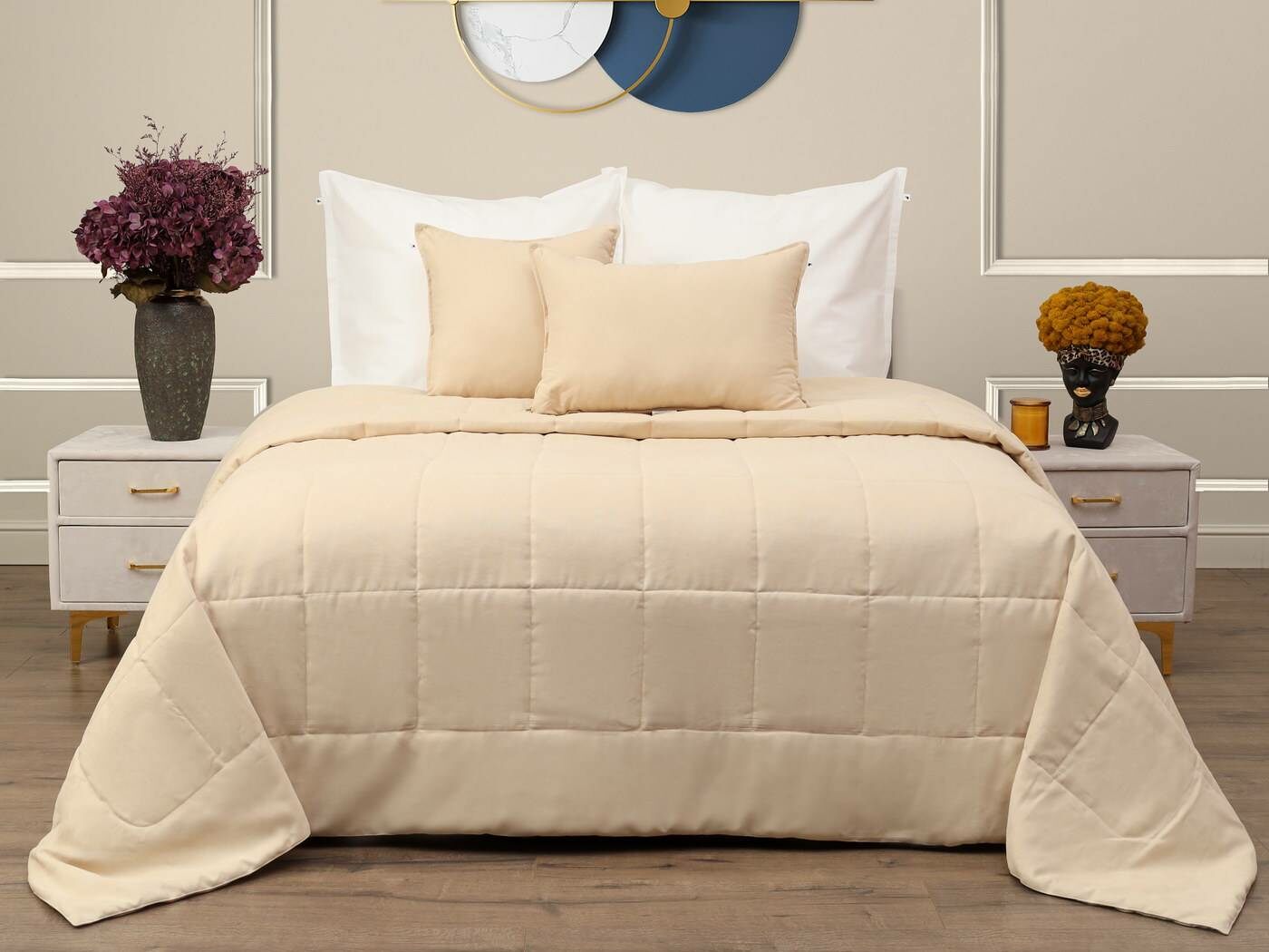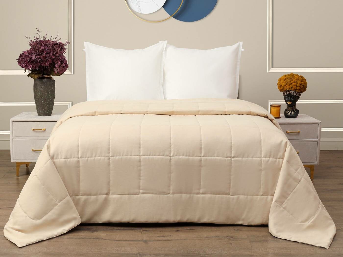 Ткань верха – бархатистый канвас. Канвас отлично себя зарекомендовал как износостойкий и плотный материал обеспечивающий мягкий противоскользящий эффект. Покрывала имеют классическую для канваса машинную стежку «квадрат». Плотная и мягкая фактура ткани канвас не оставляет зацепок, изнаночная сторона выполнена из матового и нежного тика. Такое покрывало украсит собою спальную или гостиную комнату, органично подчеркнет Ваш утонченный стиль.