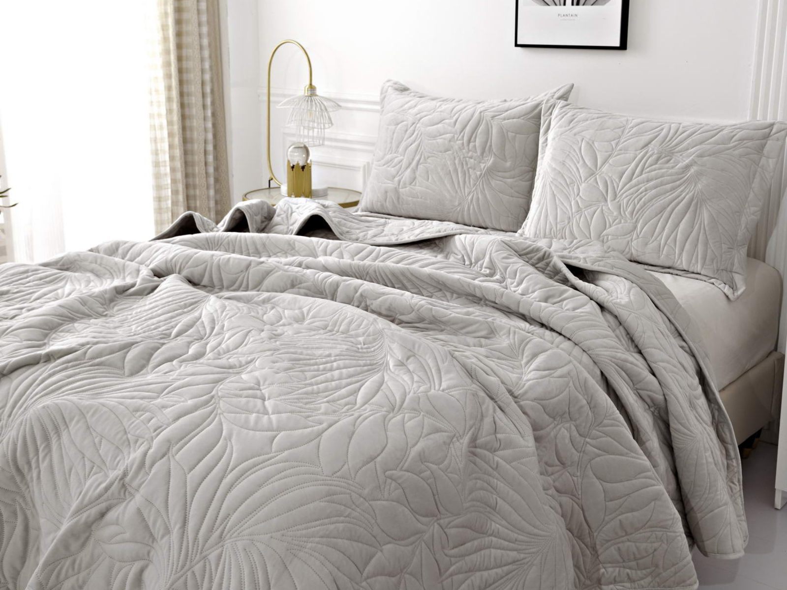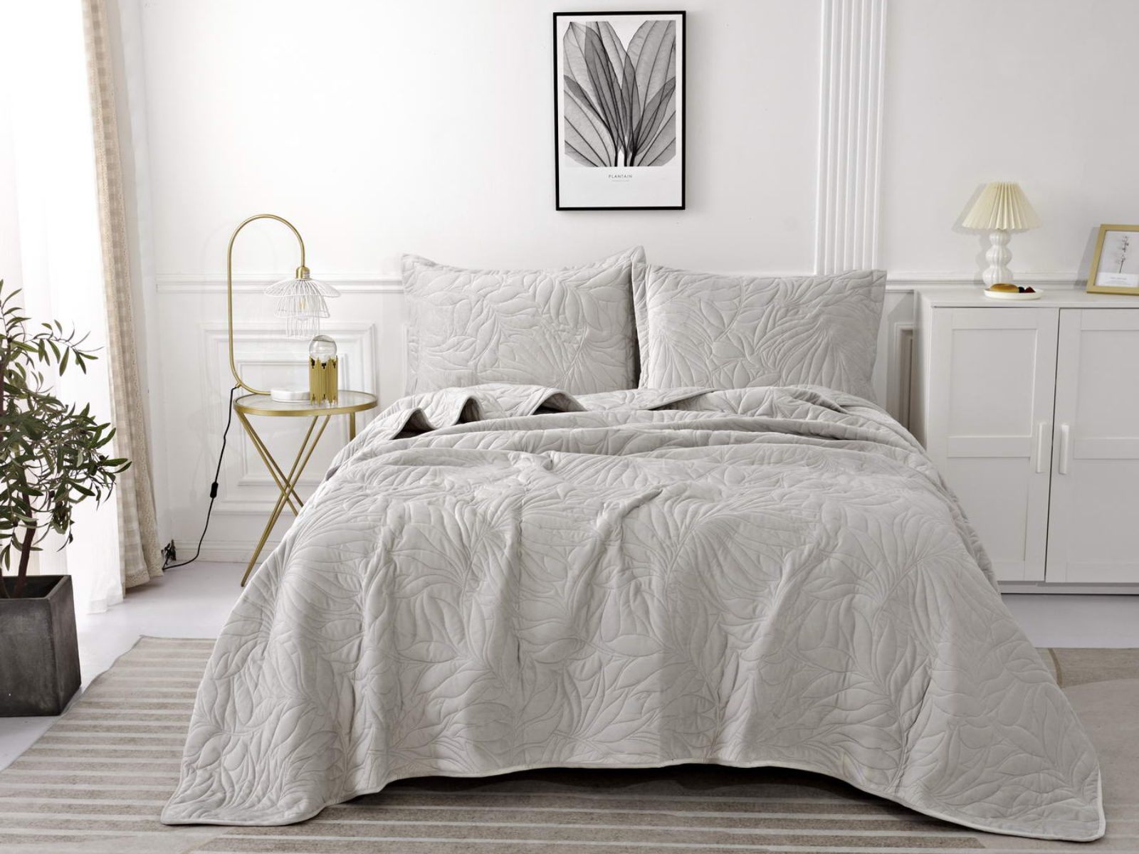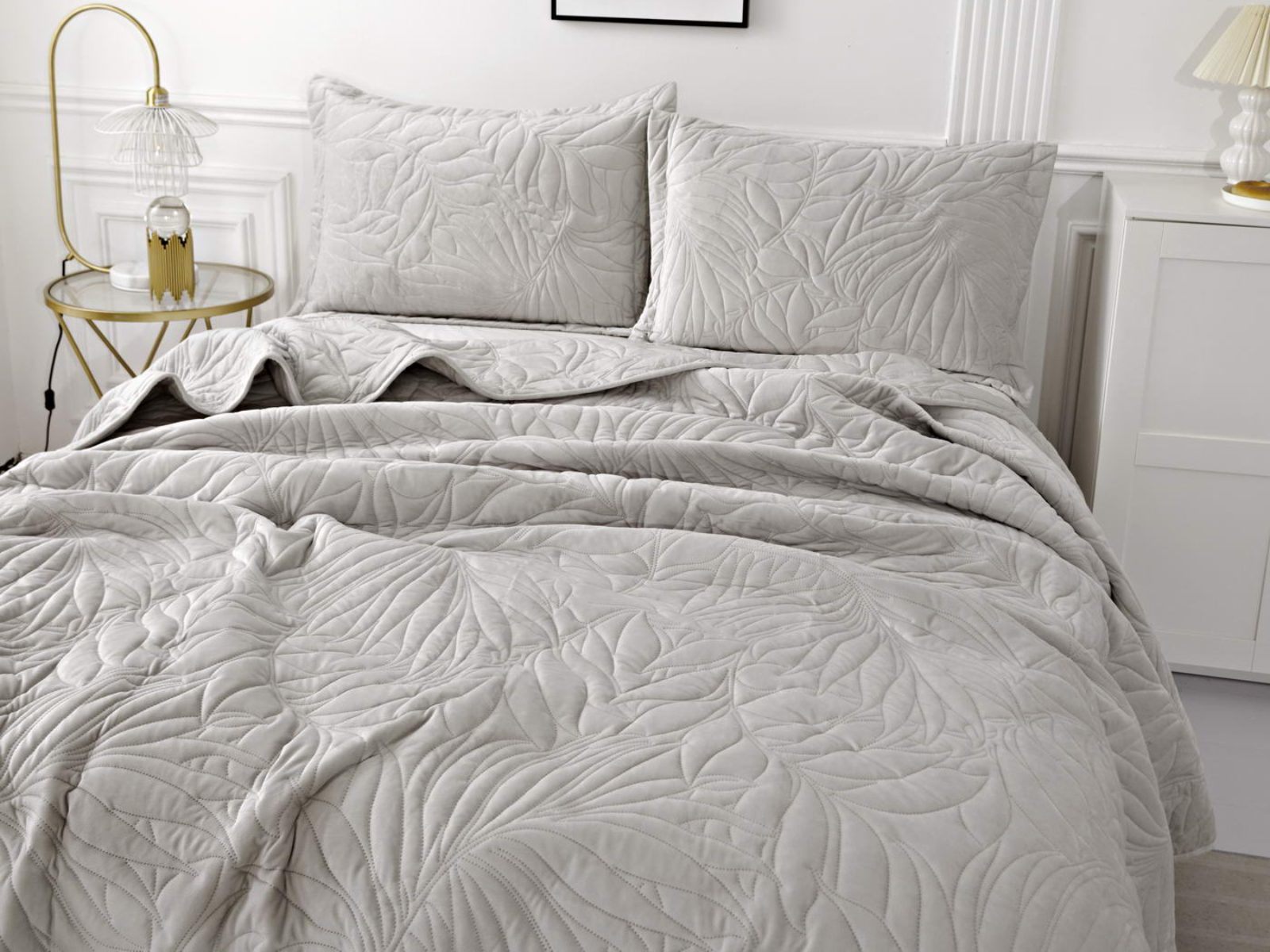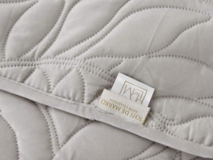 Стёганое покрывало Глория изготовлено из 100% вискозы, что делает его невероятно мягким и комфортным. Рисунок напоминает листья лавра. Такой орнамент подойдет большинству современных интерьеров.