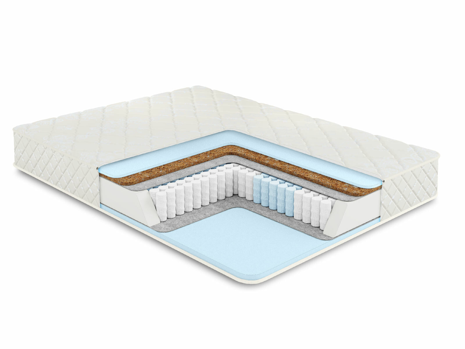 Пружинный блок S1000 состоит из независимых деталей. Каждая спираль помещена в индивидуальный чехол из спанбонда. Он защищает металл от трения и скрипа. Пружины функционируют автономно и благодаря этому способствую точечной поддержке спины. Ортопедические свойства матраса продолжают наполнители.